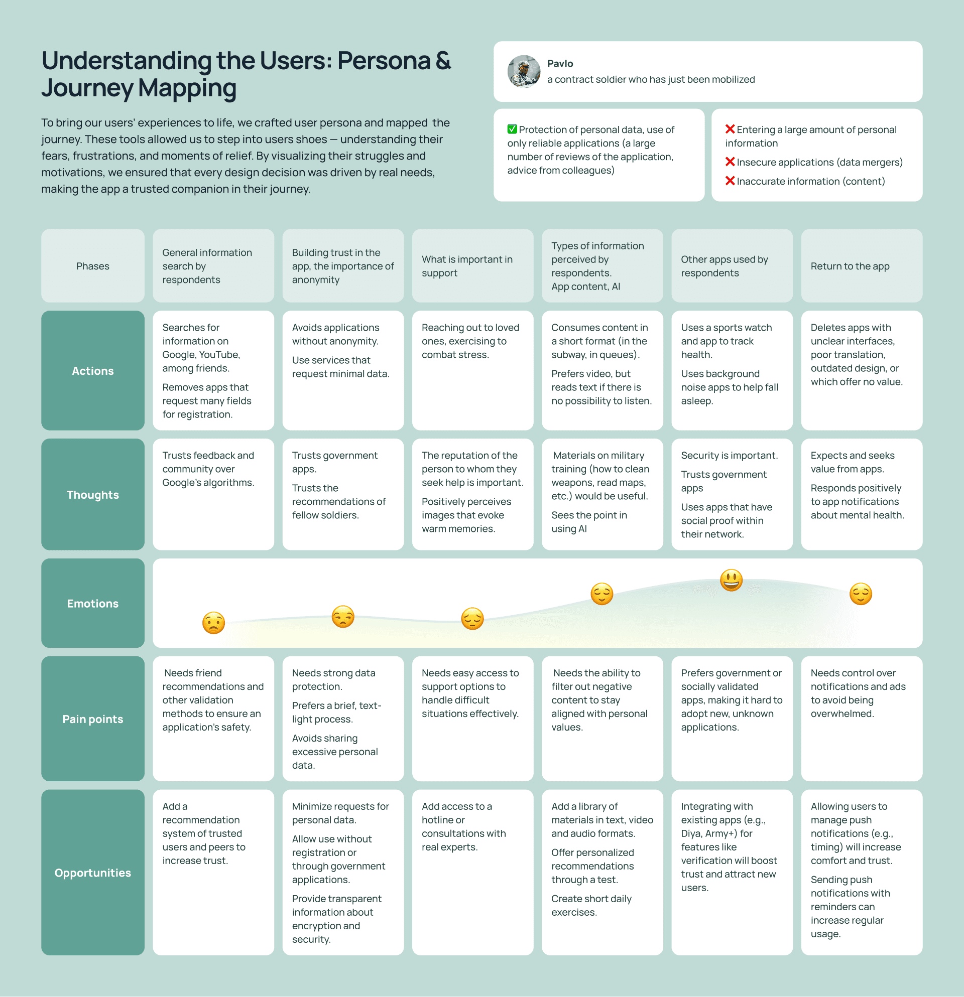 To create something truly useful, we had to step into our users’ world. We conducted interviews with three respondents to better understand their behaviors, preferences, and concerns regarding psychological support apps, particularly in the context of military personnel.