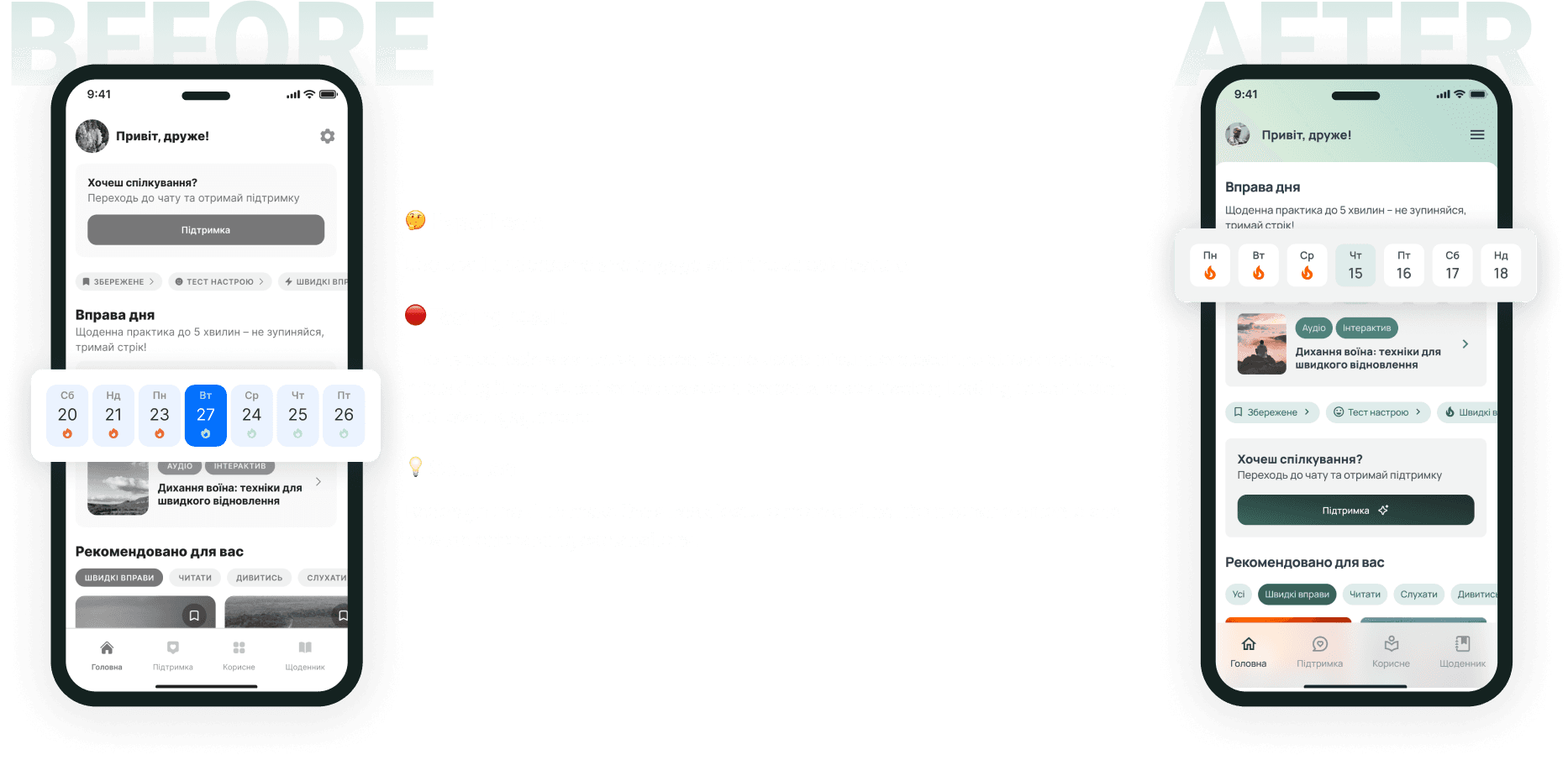 🎯 Some features also required clearer communication. Gamification elements like streaks weren’t as intuitive as expected, leading to confusion. Meanwhile, short daily exercises were useful but overlooked due to their placement on the screen. These insights emphasized that positioning and framing matter as much as the features themselves.